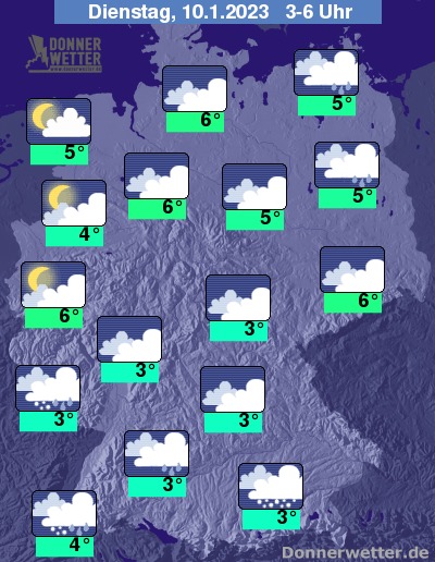 In der Nacht zum Dienstag ziehen viele und überwiegend auch dichte Wolken durch, am ehesten kann es im Westen und Nordwesten gebietsweise auflockern, hier bleibt es auch weitgehend trocken. Im Süden fällt zeitweise Regen, Schneeregen oder Schnee, sonst fällt nur selten etwas Regen. Die Temperatur sinkt auf 6 Grad in Hannover und 3 Grad in München.