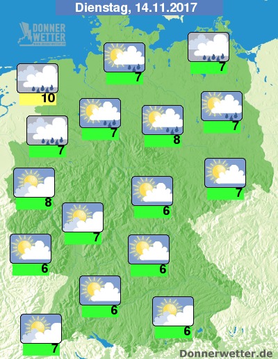 Nach Auflösung teils zäher Nebel- und Hochnebelfelder scheint in der Mitte und im Süden zeitweise die Sonne. Über den Norden ziehen dichtere Schichtwolken mit etwas Regen oder Sprühregen hinweg. Nach verbreitet frostiger Nacht mit Gefahr von Reif oder überfrierender Nässe, klettern die Temperaturen bis zum Nachmittag auf 3 bis 8 Grad. Bei zähem Nebel bleibt es kühler. An der Küste wird es dagegen mit 10 Grad etwas milder. Der Wind weht meist nur schwach, nur im Norden frischt er zeitweise auf und kommt aus Südwest.