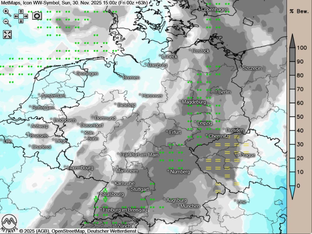 Am Sonntagnachmittag zeigt sich der Himmel über weiten Landesteilen wechselnd oder stark bewölkt, im Norden und Westen kann es zeit- und gebietsweise auch mal auflockern. Vor allem in der Süd- und Osthälfte fällt dabei etwas Regen.