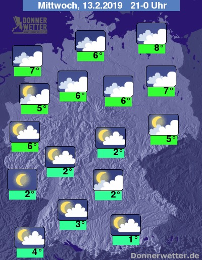 Während der zweiten Nachthälfte lichtet sich die Bewölkung auch stellenweise im Norden. Sonst leuchten bei meist nur lockerer Bewölkung verbreitet Mond und Sterne.