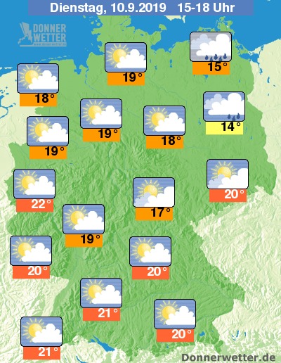 Die Temperaturen bewegen sich im Norden und Nordosten meist nur zwischen 14 und 18 Grad, sonst werden gebietsweise auch 20 Grad oder etwas mehr erreicht.