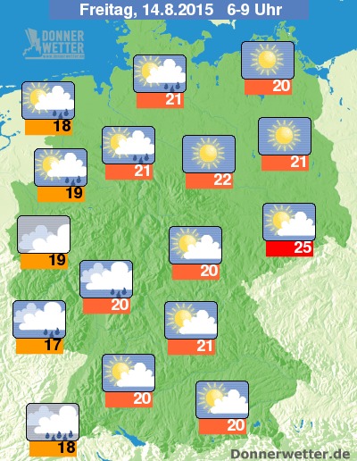 Im Süden und Osten startet der Freitag dagegen meist sonnig. Wo es schauert, steigen die Werte am Morgen auf 17 bis 19 Grad C, in Sachsen nähert sich das Quecksilber bereits in den Morgenstunden der 25-Grad-Marke an.