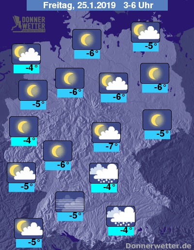 Während der zweiten Nachthälfte muss im Süden regional weiterhin mit leichtem Schneefall, oder Schneegriesel gerechnet werden, wobei die Gefahr von Glätte besteht. Sonst leuchten häufig Mond und Sterne. Nur stellenweise halten sich tiefhängende Wolken oder Nebel.