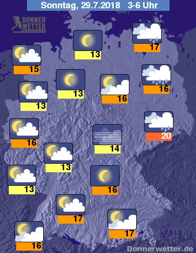 In der Nacht zum Sonntag halten sich über dem Nordosten, Osten und Südosten meist dichte Wolken, dazu bilden sich hier zeitweise Schauer sowie lokale Gewitter. Über der Westhälfte Deutschlands zeigt sich der Himmel hingegen locker bewölkt oder sternenklar, dazu bleibt es trocken. Die Temperatur sinkt auf 20 Grad in Dresden und bis 13 Grad in der Norddeutschen Tiefebene.