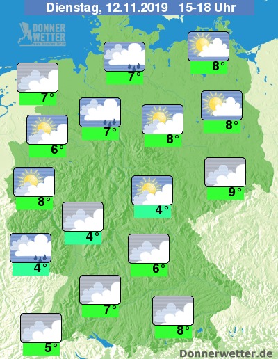 Am frühen Nachmittag fällt im Westen aus dichteren Wolken gelegentlich Regen, oder es treten örtliche Schauer auf, in höheren Lagen der Mittelgebirge können sich Schneeflocken unter die Tropfen mischen. Im übrigen Land gibt es eine Mischung aus Sonne und regionalen Aufheiterungen, stellenweise hält sich auch zäher Nebel.