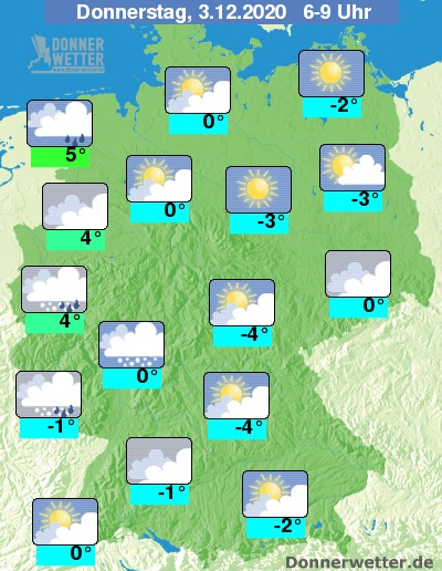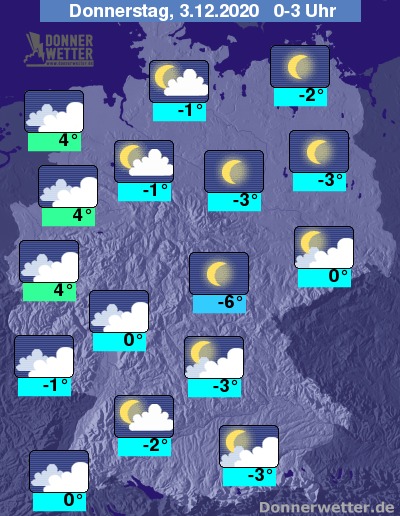 Bis zu den Frühstunden kühlt die Luft im Osten und Süden auf frostige -6 bis 0 Grad ab und es besteht die Gefahr von überfrierender Nässe oder Reif. Im Westen und Nordwesten bleibt es mit -1 bis 5 Grad milder.