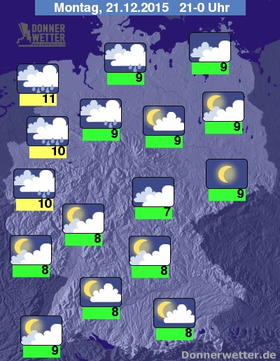 In der Nacht zum Dienstag ist es im Süden der Republik meist locker oder aufgelockert bewölkt und trocken. Sonst halten sich zunächst weitgehend dichte Wolken, aus denen immer wieder, teils kräftiger Regen fällt. Gegen Morgen klingen die Niederschläge im Norden meist ab und hier und da kann die Bewölkung auch auflockern. Die Temperatur sinkt auf 11 Grad in Aachen und etwa 6 Grad in München. Im Norden weht starker und teils stürmischer Wind mit möglichen Sturmböen, an den Küsten und auf den Bergen herrscht Sturm, dabei sind orkanartige Böen möglich.