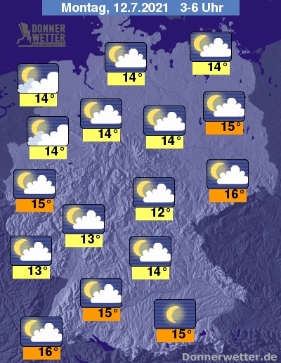 In der kommenden Nacht zeigt sich der Himmel überwiegend locker bewölkt, oft auch sternenklar. Vor allem im Nordwesten halten sich gebietsweise auch dichtere Wolken. Es bleibt landesweit trocken bei Tiefstwerten von 16 Grad in Dresden und 12 Grad in Erfurt.