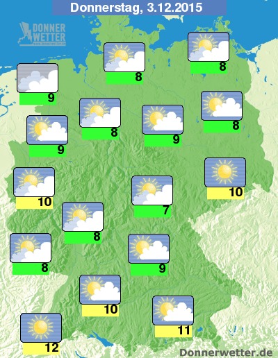 Heute zeigt sich nach Auflösung örtlicher Nebelfelder vor allem im Osten und Süden häufig die Sonne, aber auch im Norden ist es zunächst oft aufgelockert, teils aber auch schon stärker bewölkt. Im übrigen Land wechseln sich Sonne und teils dichte Wolken aneinander ab. Am Nachmittag werden die Wolken im Norden und gegen Abend auch oft im Westen dichter, im Süden bleibt es abseits von Nebel oder Hochnebel heiter bis sonnig. Es bleibt landesweit trocken. Die Temperatur steigt auf 7 Grad im Grabfeld und bis 12 Grad im Oberrhreingraben. An der Nordsee weht ein teils starker Wind.