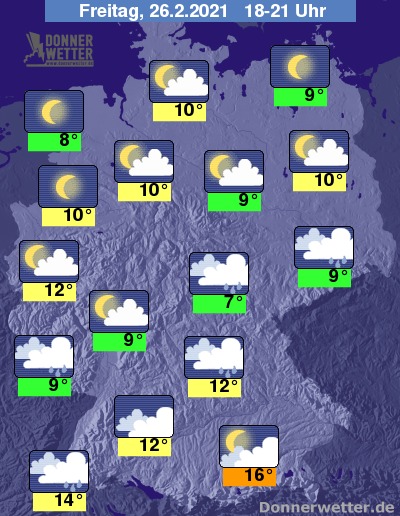Heute Abend liegt ein Regengebiet über dem Süden Deutschlands und auch noch über Sachsen und der Südosthälfte von Thürigen. Im übrigen Land ist es hingegen verbreitet locker bewölkt und häufig auch sternenklar, dazu bleibt es trocken. Die Temperatur liegt bei 7 Grad im Thüringer Becken und bis 16 Grad in München.