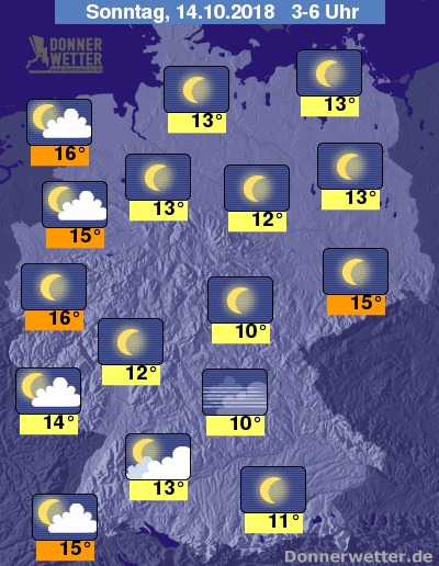 In der kommenden Nacht zeigt sich der Himmel weitgehend sternenklar, lediglich in den westlichen und südwestlichen Landesteilen ziehen örtlich einige Wolken durch, dazu bleibt es trocken. Besonders in den Flussniederungen und in Tallagen bildet sich stellenweise Nebel. Die Temperatur sinkt auf 16 Grad an der Nordsee und bis 10 Grad im Thüringer Becken.