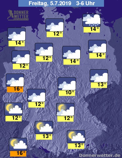 Bis zu den Frühstunden gehen die Temperaturen auf 10 Grad im Thüringer Becken und 16 Grad im Breisgau, sowie in den Ballungsgebieten des Westens zurück.