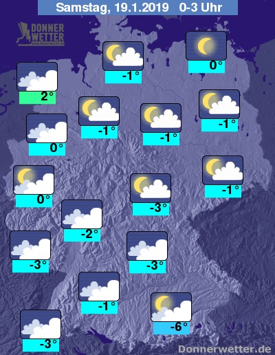 Der Samstag startet verbreitet bedeckt oder aufgelockert bewölkt, entlang der Oder sowie in der Westhälfte sind auch längere heitere Phasen zu erwarten. Schauer bleiben meist aus, die Temperaturen liegen mit Werten um -7 bis 1 Grad C nahezu bundesweit im Frostbereich.