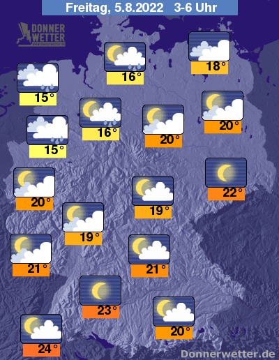 Am Freitag ist es zunächst nur im Nordwesten heiter und trocken, im großen Rest des Landes ziehen meist viele und häufig auch dichte Wolken durch, dabei bilden sich lokale Schauer und vereinzelt auch Gewitter. Im Tagesverlauf heitert es über der Nordwesthälfte auf, dann bleibt es hier trocken. Die Temperatur erreicht 19 Grad an der Nordsee und bis 38 Grad in der Lausitz.