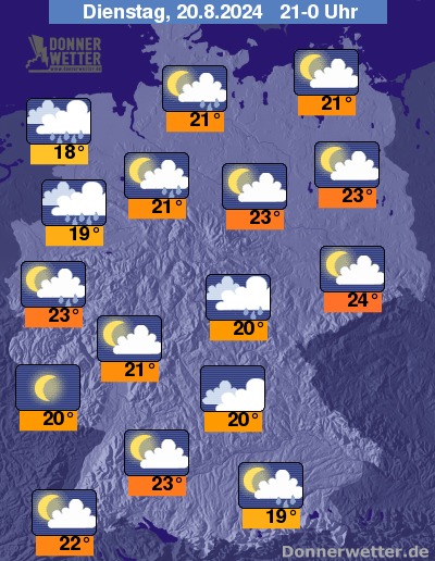 In der Nacht zum Dienstag zeigt sich der Himmel über dem Nordwesten wechselnd oder stark bewölkt; dabei fällt vom Niederrhein bis an die Nordseeküste teils schauerartiger Regen, der sich im Verlauf in die Osthälfte verlagert. Auch im Südosten sind gebietsweise Schauer und lokale Gewitter möglich.