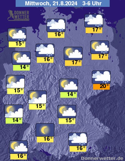 Die Temperaturen gehen in den frühen Morgenstunden zurück auf Werte um 20 bis 14 Grad.
