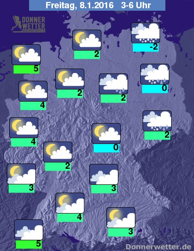 Am Freitag halten sich anfangs im Nord- und Ostseeumfeld, sowie im Nordosten noch dichte Wolken aus denen es zeitweise regnen kann, im Tagesverlauf klingen die Niederschläge hier jedoch meist ab und die Wolken lockern oft auf. Im übrigen Bundesgebiet ist es zunächst meist heiter bis sonnig, im Süden auch schon oft stark bewölkt, aber anfangs weitgehend trocken. Im Süden kommen im Tagesverlauf jedoch dichte Wolken und zeitweise Regen auf. Die Temperatur steigt auf 3 Grad in Magdeburg und bis 8 Grad in Bonn. Im Norden weht verbreitet starker bis stürmischer Wind, dabei sind auch Sturmböen möglich. An der See und auf den Bergen herrscht oft Sturm.