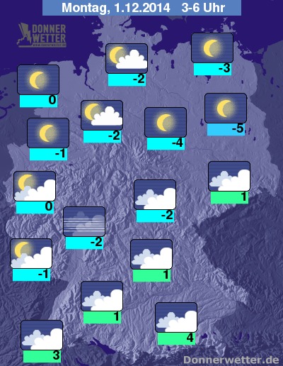 In der Nacht zum Montag halten sich im Süden und Südosten des Landes dichte Wolken, aus denen es hier und da auch regnen kann, sonst ist es häufig aufgelockert bewölkt oder neblig-trüb, im Norden dagegen meist nur locker bewölkt oder auch sternenklar und es bleibt trocken. Gebietsweise bildet sich Nebel oder Hochnebel. Die Temperatur sinkt auf 4 Grad in München und bis auf frostige -5 Grad in Potsdam.