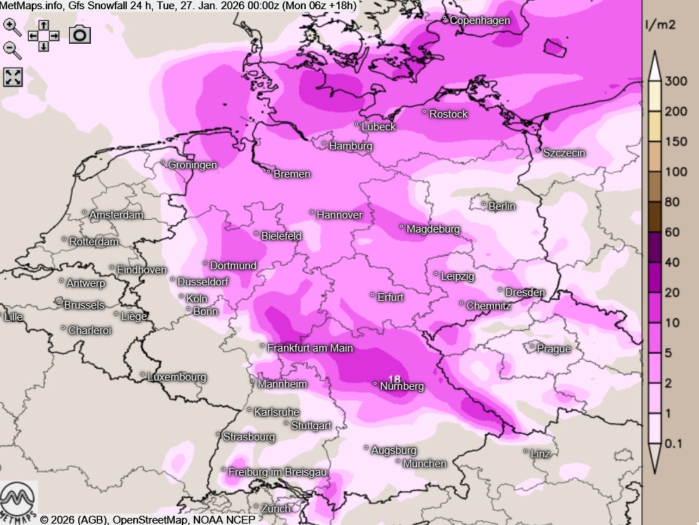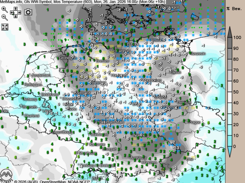 Am Montagnachmittag bleibt der Himmel über weiten Landesteilen stark bewölkt oder bedeckt; dabei gibt es vom Norden bis weit in die Landesmitte weiterhin teils ergiebige Schneefälle. In den tieferen Lagen Süddeutschlands fallen die Niederschläge teils auch als Regen, lokal auch gefrierend mit Glättegefahr!