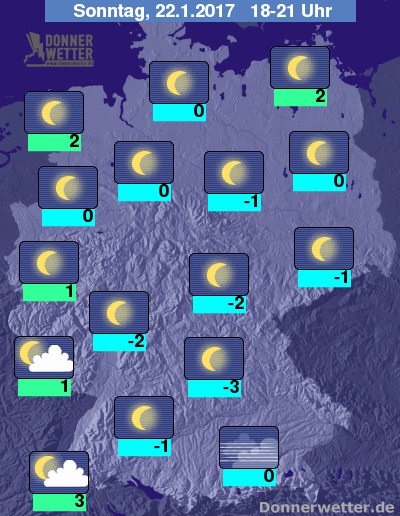 In den späteren Abendstunden des Sonntags zeigt sich der Himmel über weiten Landesteilen sternenklar, im Alpenvorland kann sich stellenweise Nebel bilden. Zwischen Mosel und Breisgau nimmt die Bewölkung im weiteren Nachtverlauf zu.