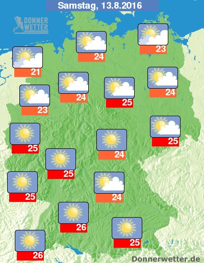Am Samstag ist es über dem Land verbreitet heiter, besondes über der Südhälfte oft auch sonnig. Im Norden können hier und da auch mal dichtere Wolken durchziehen, dabei sind einzelne Schauer nicht ausgeschlossen, sonst bleibt es trocken bei 21 bis 26 Grad.
