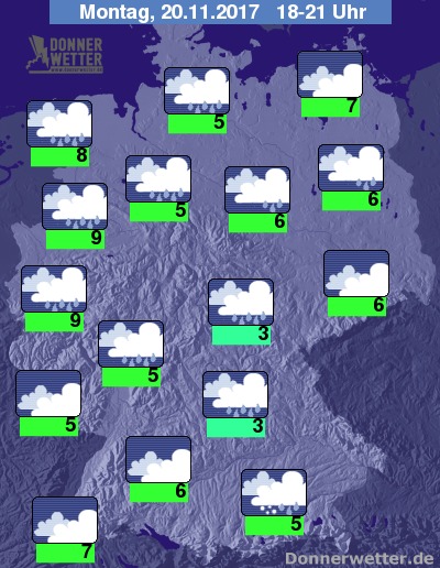 Heute Abend bleibt es bei dichter Bewölkung und nur im äußeren Südwesten bleibt es weitgehend trocken, sonst fällt immer wieder, teils auch langanhaltender und kräftiger Regen, im Südosten hier und da auch Schneeregen oder Schnee. Die Temperatur liegt bei 3 Grad im Grabfeld und 9 Grad am Niederrhein.