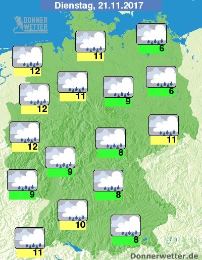 Am Dienstag ist es weiterhin wolkenverhangen und es fällt verbreitet Regen, regional auch kräftig oder langanhaltend. Die Temperatur steigt auf 6 bis 12 Grad.
