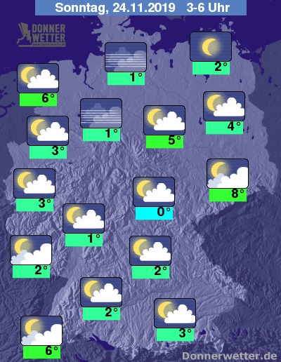 Am Sonntag ist es teils stark bewölkt oder trüb, gebietsweise heitert es aber auch auf oder es wird gar sonnig, dabei bleibt es im gesamten Bundesgebiet trocken. Die Temperatur erreicht 5 Grad im Grabfeld und bis 12 Grad in München.