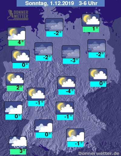 In der kommenden Nacht bleibt es über der Nordosthälfte des Landes meist sternenklar oder nur leicht bewölkt. Dagegen ziehen im Südwesten und im Verlauf auch im Westen und Süden zunehmend dichtere Wolken auf, die zum Morgen hin im Südwesten auch Regen, Schneeregen oder Schnee bringen können. Dazu besteht regional Glättegefahr! Im übrigen Land bleibt es trocken bei 4 Grad in Emden und bis -4 Grad in Suhl.