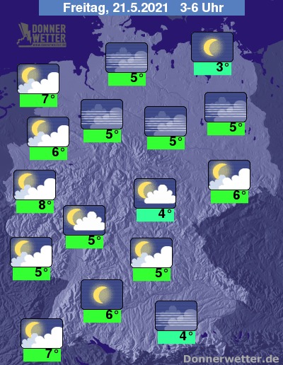In der kommenden Nacht ist es über dem Land verbreitet locker bewölkt oder sternenklar. Im Laufe der zweiten Nachthälfte ziehen von Westen her mehr und teils dichte Wolken auf, die zum Morgen hin auch den Osten erreichen, dazu bleibt es aber trocken. Die Temperatur sinkt auf 8 Grad in Bonn und bis 3 Grad in Stralsund.