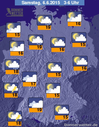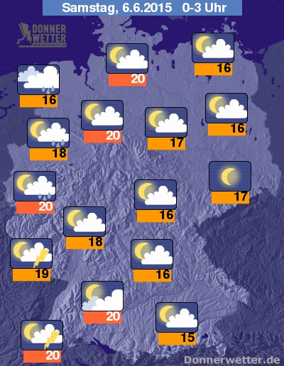 In der zweiten Nachthälfte setzen sich Schauer und Gewitter im Westen und Südwesten, später dann auch im Norden Deutschlands, fort. In den übrigen Landesteilen bleibt es bei meist lockerer Bewölkung trocken.