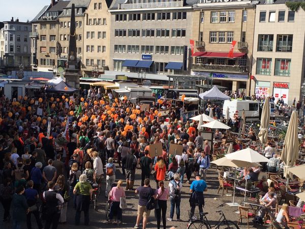 Es wird wohl ein ähnlich schöner Tag, wie am Samstag. Hier Photos aus Bonn vom Marktplatz aus Bonn bei der Seebrücke-Demo.