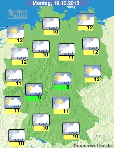 Der Start in die neue Wetterwoche präsentiert sich im wesentlichen so, wie die alte Woche endete, denn es ziehen immer wieder dichte Wolken durch, aus denen zeitweise Regen fällt. Jedoch kann sich gebietsweise auch die Sonne zeigen. Die Temperatur erreicht 9 Grad im Eichsfeld und bis 13 Grad an der Neiße.