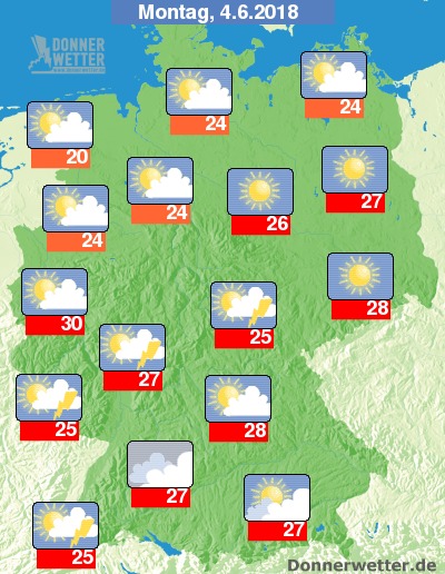 Am Montag können sich vor allem entlang von Ober- und Mittelrhein gebietsweise Schauer und einzelne Gewitter entwickeln. Vereinzelt sich jedoch auch über der übrigen Südhälfte Schauer und Gewitter möglich, sonst ist es hingegen verbreitet heiter bis sonnig und trocken. Die Temperatur steigt auf 20 Grad an der Nordseeküste und 30 Grad in der Kölner Bucht.