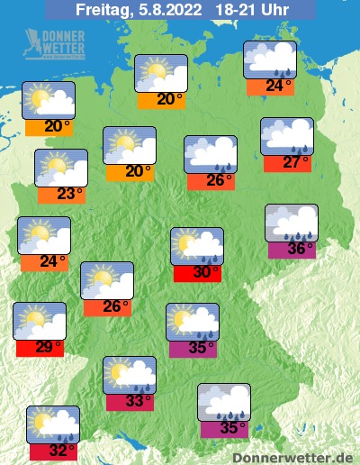 Heute Abend ziehen über den Süden und Osten kompakte Wolken hinweg und es bilden sich verbreitet Schauer sowie örtliche, teils kräftige Gewitter. Im Norden und Westen lockert die Bewölkung mehr und mehr auf und es bleibt trocken. Die Temperatur liegt bei angenehmen 20 Grad in Hamburg und anfangs noch extrem heißen 36 Grad in Dresden.