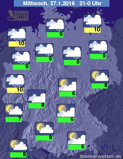 In der Nacht zum Donnerstag breiten sich die dichten Wolken und der teils kräftige Regen noch weiter nach Süden und Osten hin aus, bis zum Morgen bleibt es nur im Süden noch weitgehend trocken und dabei auch noch oft aufgelockert, teils jedoch auch stark bewölkt. In den übrigen Landesteilen bleibt es bedeckt und es fällt immer wieder, zum Teil kräftiger Regen. Die Temperatur sinkt auf 11 Grad in Köln und bis 5 Grad in München. Es weht verbreitet frischer und teils starker Wind.