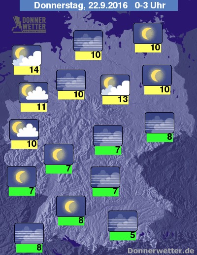 Die Temperaturen sinken in der Nacht auf Werte um 14 Grad C in Ostfriesland und um 5 Grad C am Alpenrand.