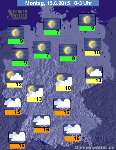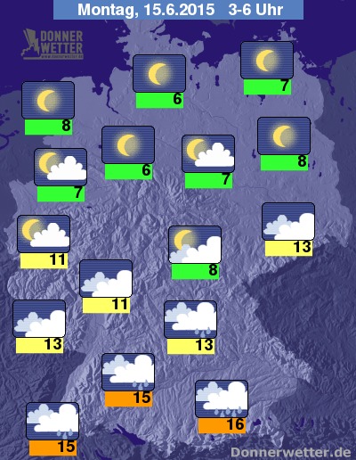Wo es aufklart, sinken die Temperaturen im Nachtverlauf auf Werte um 6 Grad C, in den Regengebieten werden Werte um 16 bis 13 Grad C erreicht.