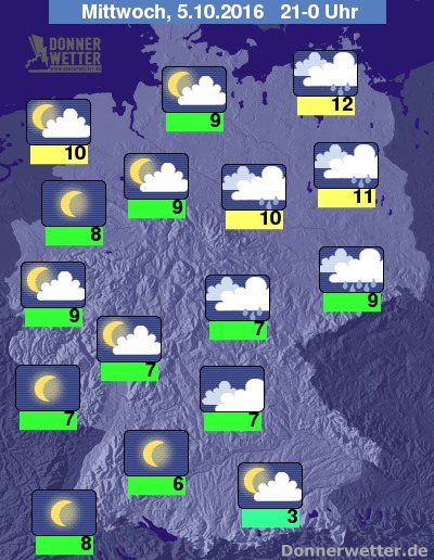 Am Abend ist es im Südwesten heiter oder sonnig. Von Oberfranken bis zum Münsterland ist der Himmel zeitweise bewölkt, wobei sich Sonne und Wolken abwechseln. An der Osteseeküste und entlang der Oder ist der Himmel bedeckt, entlang der Oder sind zudem Schauer möglich.