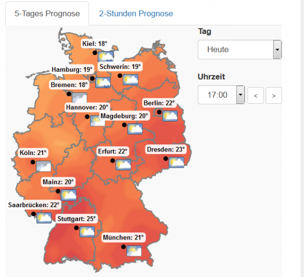 Am Nachmittag scheint fast überall die Sonne. Ausnahmen bilden die Nordsee- und Ostseeküste mit vielen Wolken und Schauern. Es wird mit 20-22 Grad C warm und sonnig.