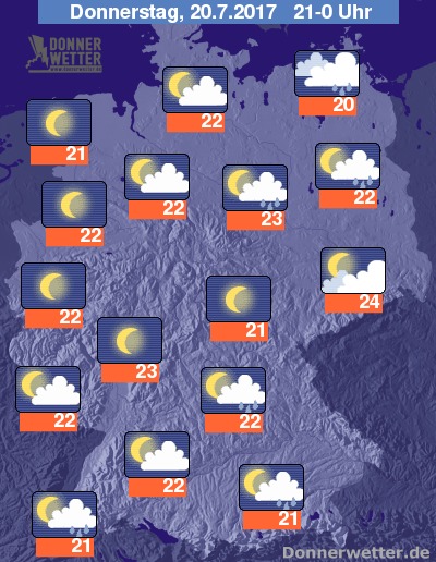 Im Lauf der Nacht fallen die Temperaturen auf Tiefstwerte um die 16 Grad an der Ostsee und auf Werte um die 10 Grad am Rhein.