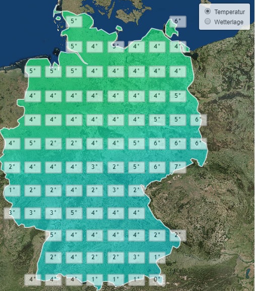 Die Kaltluft erreicht das Land erst im Lauf des Freitags, dennoch liegen die Tiefsttemperaturen im Süden bereits am Morgen verbreitet bei Werten um den Gefrierpunkt. Etwas milder geht es mit bis zu 7 Grad im östlichen Sachsen zu.