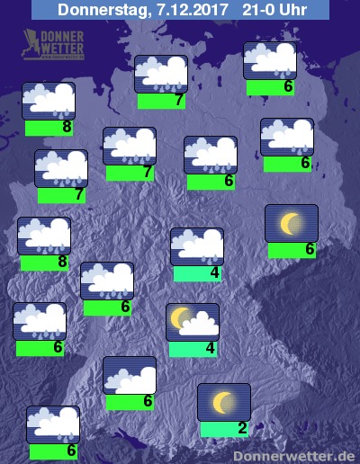 Die Kaltfront, die den Nordwesten des Landes bereits am Nachmittag erreicht hat, breitet sich im Lauf der Nacht weiter südostwärts aus. Bis zum Morgen erreichen die Schauer auch die südöstlichsten Landesteile, während es im Nordwesten langsam wieder abtrocknet. In den höheren Lagen der Mittelgebirge und am Alpenrand geht der Regen dabei bereits in der Nacht in Schnee über, dazu weht ein stürmischer Wind, der in den Höhenlagen vereinzelt auch Orkanstärke erreichen kann.