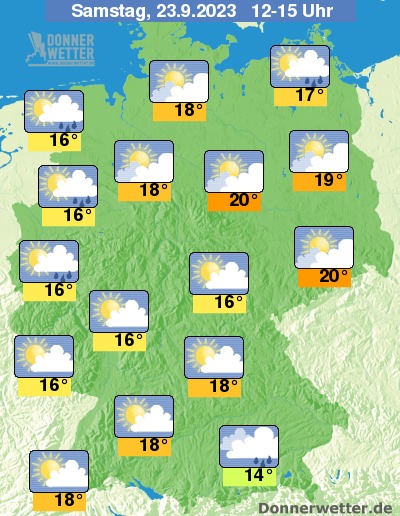Heute Nachmittag ist es über dem Norden und Nordwesten teils heiter, teils stark bewölkt, dabei können sich einzelne Schauer bilden. Im äußeren Süden fällt aus dichten Wolken gebietsweise Regen. Im großen Rest des Landes ist es meist heiter oder wechselnd bewölkt und trocken. Die Temperatur liegt bei 14 Grad in München und bis 20 Grad in Magdeburg.