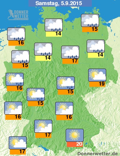 Am Samstag ist es wohl im Süden noch am freundlichsten und bei meist lockerer bis aufgelockerter Bewölkung bleibt es vorraussichtlich trocken. Weiter nach Norden hin werden die Wolken allerdings zahlreicher und auch dichter, dabei können sich wiederholt Schauer, selten auch einzelne Gewitter bilden. Die Temperatur steigt auf 14 Grad in der Lüneburger Heide und bis 20 Grad in München.