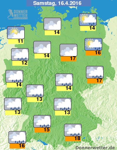 Am Samstag halten sich im Land überwiegend dichte Wolken, im Norden und über der breiten Mitte sind jedoch gelegentliche Auflockerungen möglich. Über der Südhälfte Deutschlands fällt zeitweise Regen, im Südwesten bilden sich lokal auch Gewitter, im übrigen Bundesgebiet bilden sich einzelne Schauer, oft bleibt es aber auch trocken. Die Temperatur steigt auf 11 Grad an der Nordseeküste und auf 18 Grad in Rosenheim.