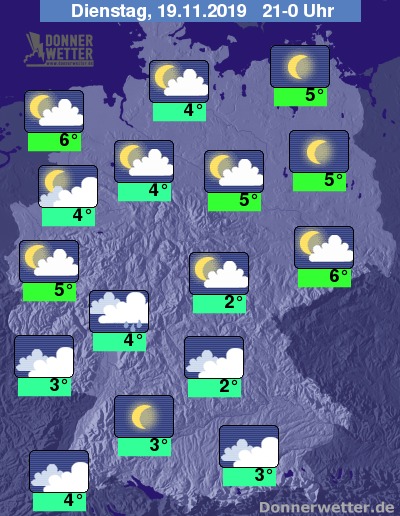 Am Abend bleibt es bis auf wenige Ausnahmen im Norden niederschlagsfrei. Dazu gibt es eine Mischung aus Wolken und Sternen. Insbesondere im Südwesten bleibt die Wolkendecke auch dichter.