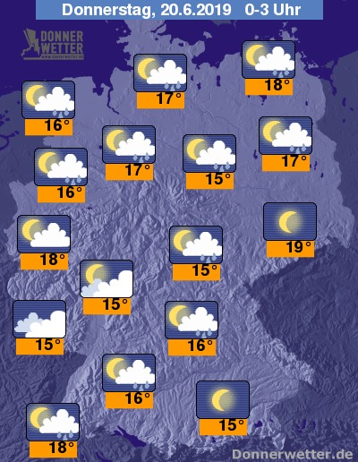 In der Nacht zeigt sich der Himmel zunächst überwiegend locker oder aufgelockert bewölkt, im Verlauf nimmt die Bewölkung vor allem in der Westhälfte gebietsweise zu. Verbreitet muss anfangs mit Schauern gerechnet, in der zweiten Nachthälfte konzentrieren sich die Niederschläge dann meist nur noch auf die Südhälfte des Landes.