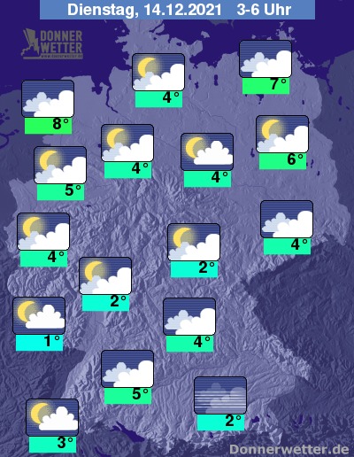 In der Nacht zum Dienstag ist der Himmel überwiegend stark, gebietsweise auch etwas aufgelockert bewölkt. Vor allem im Süden bildet sich stellenweise Nebel. Es bleibt weitgehend trocken bei Tiefstwerten von 8 Grad an der Nordsee und bis 1 Grad am Pfälzer Wald.
