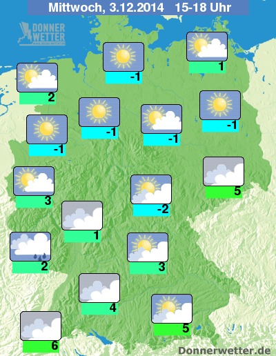 Heute Abend ist es häufig trüb oder hochnebelartig bewölkt, gebietsweise, vor allem im Norden ist es aber auch locker bewölkt oder sternenklar, dazu bleibt es weitgehend trocken. Die Abendtemperatur liegt bei 4 Grad im Oberrheingraben und um -3 Grad in der Norddeutschen Tiefebene.
